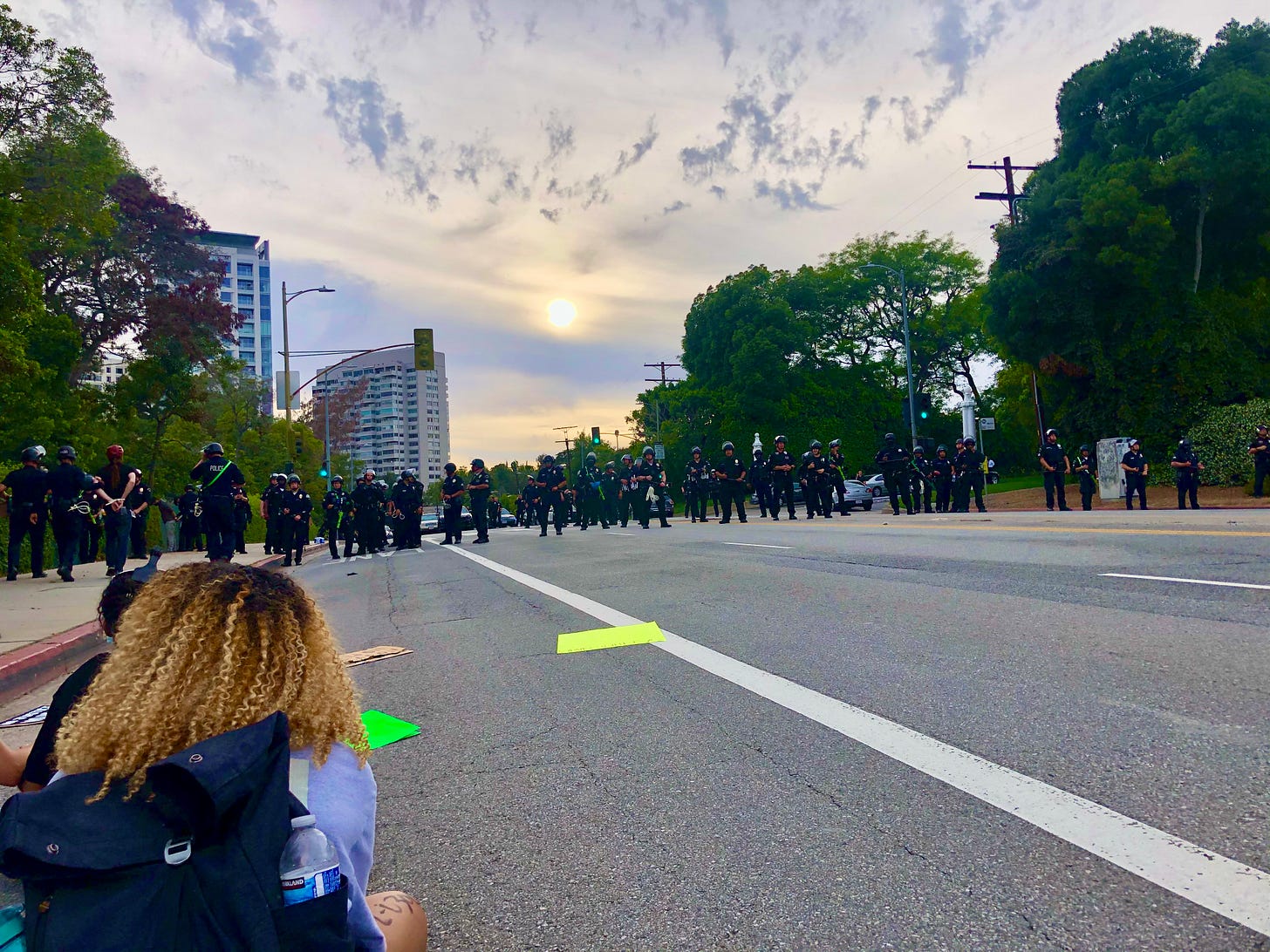 We marched through Brentwood and Westwood and then we started marching towards Beverly Hills, but we never made it. Outside a golf course, we were sandwiched by police from the front and back, with riot shields and helmets and tanks, a sea of tanks, right next to what might have been the 14th hole, and then some of the protestors started shouting for all the white people to get to the front of the group. I started sort of sheepishly scooting forward but was interrupted by a policeman who announced on a speaker from behind us that it was after the 1pm curfew, and that this was our last chance to get out before being arrested. All fifty of us, I bet, would have been happy to go home then.